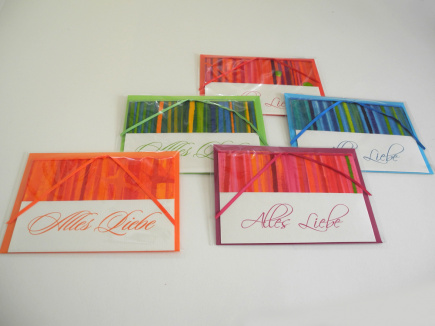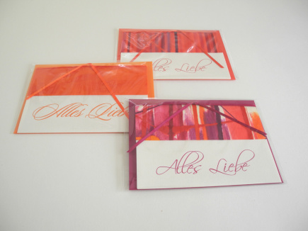 Die, mit "Alles Liebe" bedruckte Klappkarte ist mit einem handgemachten Buntpapier verziert und beide sind mit einem Satinband zusammen gebunden. Farblich gleich sind bei (fast) allen der Umschlag, das Satinband und die Schriftfarbe. Die verwendeten Buntpapiere sind immer ein Unikat. Es gibt Farbkombinationen und „Muster“ die es ähnlich immer wieder gibt, aber auch ganz einmalige Stücke. Karte: 150 x 105 Umschlag: Din C6 162 x 114mm