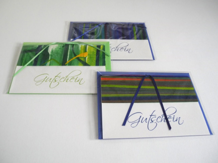 Die, mit "Gutschein" bedruckte Klappkarte ist mit einem handgemachten Buntpapier verziert und beide sind mit einem Satinband zusammen gebunden. Farblich gleich sind bei (fast) allen der Umschlag, das Satinband und die Schriftfarbe. Die verwendeten Buntpapiere sind immer ein Unikat. Es gibt Farbkombinationen und „Muster“ die es ähnlich immer wieder gibt, aber auch ganz einmalige Stücke. Karte: 150 x 105 Umschlag: Din C6 162 x 114mm