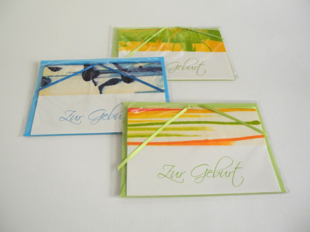 Die, mit "Zur Geburt" bedruckte Klappkarte ist mit einem handgemachten Buntpapier verziert und beide sind mit einem Satinband zusammen gebunden. Farblich gleich sind bei (fast) allen der Umschlag, das Satinband und die Schriftfarbe. Die verwendeten Buntpapiere sind immer ein Unikat. Es gibt Farbkombinationen und „Muster“ die es ähnlich immer wieder gibt, aber auch ganz einmalige Stücke. Karte: 150 x 105 Umschlag: Din C6 162 x 114mm