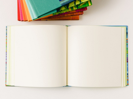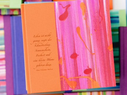 Format 17 x 17 und 1,5cm dick mit 144 Seiten. Das Papier ist naturweiß mit Büttenstruktur und der Buchblock fadengeheftet. Eingebunden in Gewebe (Buchbinderleinen) bedruckt, überzogen mit farbenfrohem handgemachtem Papier und Farbschnitt.