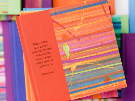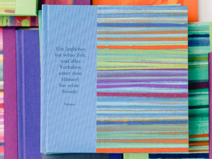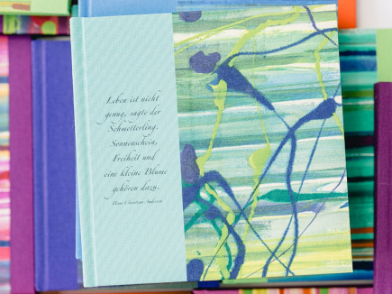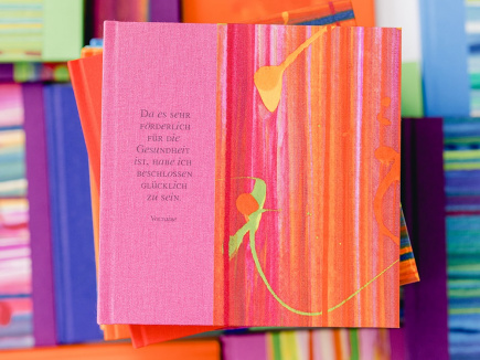 Eigentlich ist ja alles bei mir ziemlich bunt – bei diesen Büchern ist der Buchschnitt auch noch passend eingefärbt – die Seiten sind innen trotzdem weiß. Zudem ist vorne auf jedem Buch ein kleiner Text gedruckt – humorvoll oder nachdenklich, aber immer mit Tiefgang. Fröhlich und handlich – wunderbar geeignet, als Tagebuch oder Gästebuch und zum Sammeln von Sprüchen und schönen Erinnerungen.