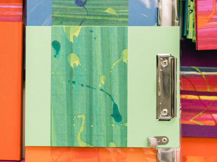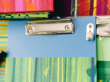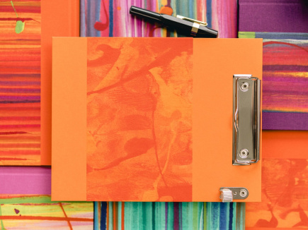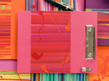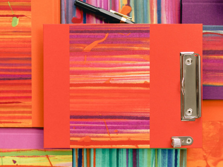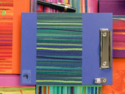 Farbenfrohes Klemmbrett für A4 Papier Format 24 x 32 aus stabiler 2,5mm dicker Buchbindepappe und eingebunden in F-color (farbiges Vorsatzpapier) und überzogen mit farbenfrohem handgemachtem Papier.