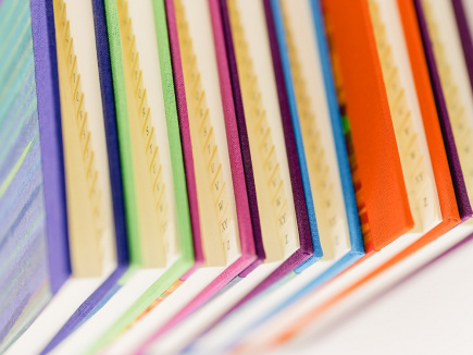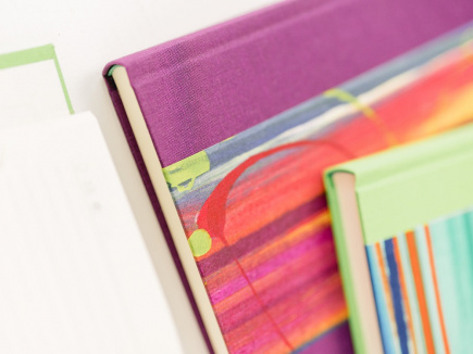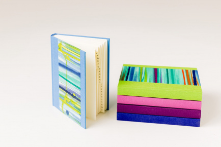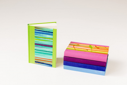 Format 15 x 21,5 und ca. 1,5cm dick. Fadengeheftet und eingebunden in Gewebe (Buchbinderleinen) und überzogen mit farbenfrohem handgemachtem Papier.