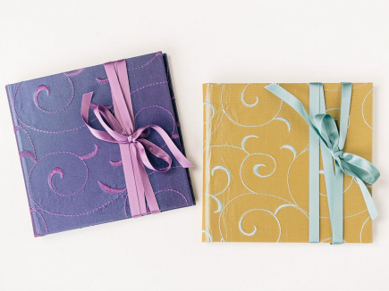 Format 17,5 x 18,5 und ca. 1,5cm dick. Fotokarton (17x17) schwarz oder naturweiß für 10 Bilder - eingebunden in Satin- oder Seidenstoffe mit farblich passenden Satinband.