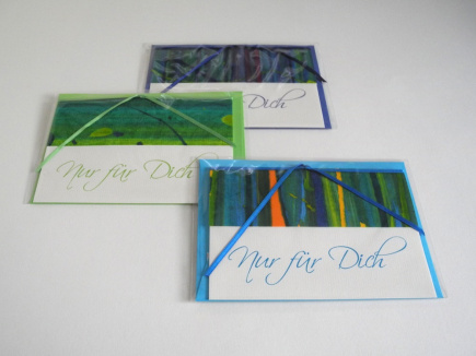 Die, mit "Nur für Dich" bedruckte Klappkarte ist mit einem handgemachten Buntpapier verziert und beide sind mit einem Satinband zusammen gebunden. Farblich gleich sind bei (fast) allen der Umschlag, das Satinband und die Schriftfarbe. Die verwendeten Buntpapiere sind immer ein Unikat. Es gibt Farbkombinationen und „Muster“ die es ähnlich immer wieder gibt, aber auch ganz einmalige Stücke. Karte: 150 x 105 Umschlag: Din C6 162 x 114mm