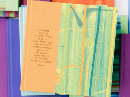 Eigentlich ist ja alles bei mir ziemlich bunt – bei diesen Büchern ist der Buchschnitt auch noch passend eingefärbt – die Seiten sind innen trotzdem weiß. Zudem ist vorne auf jedem Buch ein kleiner Text gedruckt – humorvoll oder nachdenklich, aber immer mit Tiefgang. Fröhlich und handlich – wunderbar geeignet, als Tagebuch oder Gästebuch und zum Sammeln von Sprüchen und schönen Erinnerungen.