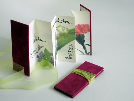 Sag es mit Blumen Entstanden 2015 in Zusammenarbeit mit Iris Schlichte. Betrachtung von Primel, Margerite, Rote Rose, Veilchen, Maiglöckchen, Nelke in Wort und Fotografie. 13,7 x 5,7 cm Velours pink mit hellgrünem Band