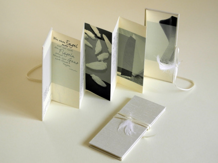 Engel in Stein und Papier Entstanden 2003 in Zusammenarbeit mit Monika Mayer und Jochen Herzog . Abbildung von Stein- und Papierobjekten und Texten rund um das Thema Engel. 13,7 x 5,7 cm Leinen naturweiß mit Feder am Band
