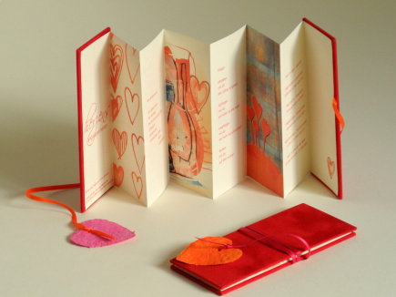 Herzensangelegenheiten Entstanden 2009 in Zusammenarbeit mit Lisa Tögel. Illustrationen und Texte zur Liebe. 13,7 x 5,7 cm Velours rot mit orangen oder pinkfarbenen Herz am wechselfarbigen Band