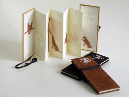 Kleine Hundeschule Entstanden 2011 in Zusammenarbeit mit Lisa Tögel. Schattenumrisse und ausgesuchte Texte rund um das Thema Hund. 13,7 x 5,7 cm Velours in drei Brauntönen mit weißer Prägung und Band