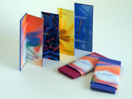 Neuland - Ruhestand Entstanden 2016 in Zusammenarbeit mit Iris Schlichte. Fotografien und kurze Textimpulse für den neuen Lebensabschnitt. 13,7 x 5,7 cm Papier blau oder magenta mit farbiger Banderole