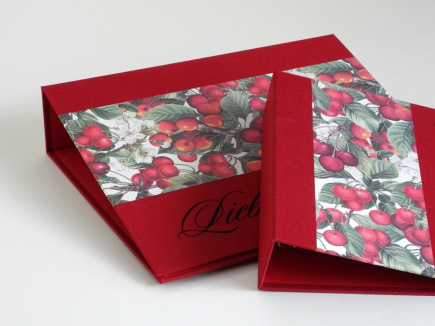 Dieser schmucke große Ordner macht Appetit und Laune auf Küchenaktivitäten. Der Einband ist in einem dunklem warmen Rot. Den Deckel zieren ein üppiges Kirschenmotiv aus dem Hause Tassotti und der Titel: Lieblingsrezepte. Dank Ringmechanik in handelsüblichem Lochabstand passen A4-Blätter oder Blätter in A4-Folientaschen hinein. Es ist auch ein tolles Geschenk für jeden Hobbykoch. Format 32 x 26,5 x 7,5 cm Überzugsmaterial Gewebe und Papier