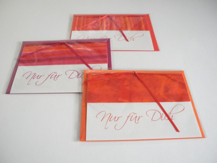 Die, mit "Nur für Dich" bedruckte Klappkarte ist mit einem handgemachten Buntpapier verziert und beide sind mit einem Satinband zusammen gebunden. Farblich gleich sind bei (fast) allen der Umschlag, das Satinband und die Schriftfarbe. Die verwendeten Buntpapiere sind immer ein Unikat. Es gibt Farbkombinationen und „Muster“ die es ähnlich immer wieder gibt, aber auch ganz einmalige Stücke. Karte: 150 x 105 Umschlag: Din C6 162 x 114mm