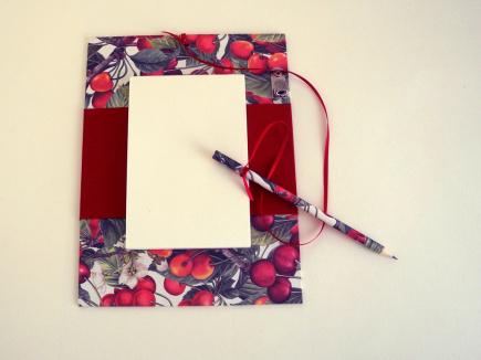 Der Küchenmerker ist eine nützliche Einkaufshilfe, die wunderschön und elegant daherkommt. Der feste Pappdeckel ist mit einem üppigen Kirschenmotiv aus der Papeterie Tassotti überzogen. Er kann durch ein Loch an einem Nagel auf gehangen werden. Der Bleistift ist mit dem gleichen Papier überzogen. Er steckt in einem Metallstifthalter und ist zur Sicherheit mit einem Satinband an dem Merker festgebunden. Ein breiter, warm dunkelroter Streifen aus Leinengewebe hält einen Zettelblock (austauschbar) fest. Format 18 x 24 Eignet sich perfekt als Einzugsgeschenk oder Mitbringsel zur Party.