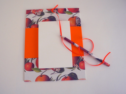 Der Küchenmerker ist eine nützliche Einkaufshilfe, die wunderschön und elegant daherkommt. Der feste Pappdeckel ist mit einem pittoresken Orangenmotiv aus der Papeterie Tassotti überzogen. Er kann durch ein Loch an einem Nagel auf gehangen werden. Der Bleistift ist mit dem gleichen Papier überzogen. Er steckt in einem Metallstifthalter und ist zur Sicherheit mit einem Satinband an dem Merker festgebunden. Ein breiter, leuchtend oranger Streifen aus Leinengewebe hält einen Zettelblock (austauschbar) fest. Format 18 x 24 Eignet sich perfekt als Einzugsgeschenk oder Mitbringsel zur Party.