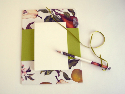 Der Küchenmerker ist eine nützliche Einkaufshilfe, die wunderschön und elegant daherkommt. Der feste Pappdeckel ist mit einem rustikalen Birnenmotiv aus der Papeterie Tassotti überzogen. Er kann durch ein Loch an einem Nagel auf gehangen werden. Der Bleistift ist mit dem gleichen Papier überzogen. Er steckt in einem Metallstifthalter und ist zur Sicherheit mit einem Satinband an dem Merker festgebunden. Ein breiter, erfrischend hellgrüner Streifen aus Leinengewebe hält einen Zettelblock fest. Format 18 x 24 Eignet sich perfekt als Einzugsgeschenk oder Mitbringsel zur Party.