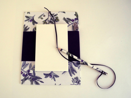 Der Küchenmerker ist eine nützliche Einkaufshilfe, die wunderschön und elegant daherkommt. Der feste Pappdeckel ist mit einem mediterranen Olivenmotiv aus der Papeterie Tassotti überzogen. Und er kann durch ein Loch an einem Nagel auf gehangen werden. Der Bleistift ist mit dem gleichen Papier überzogen. Er steckt in einem Metallstifthalter und ist zur Sicherheit mit einem Satinband an dem Merker festgebunden. Ein breiter, satt auberginefarbener Streifen aus Leinengewebe hält einen Zettelblock fest. Format 18 x 24 Eignet sich perfekt als Einzugsgeschenk oder Mitbringsel zur Party.