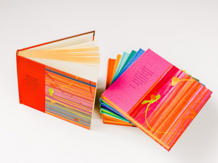 Format 17 x 17 und 1,5cm dick mit 144 Seiten. Das Papier ist naturweiß mit Büttenstruktur und der Buchblock fadengeheftet. Eingebunden in Gewebe (Buchbinderleinen) bedruckt, überzogen mit farbenfrohem handgemachtem Papier und Farbschnitt.