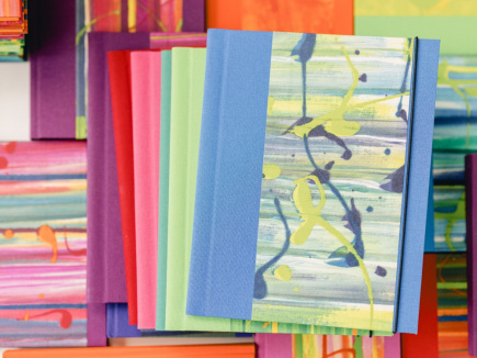 Format 23 x 32 mit 3cm Füllmenge. Eingebunden in Gewebe (Buchbinderleinen) und überzogen mit farbenfrohem handgemachtem Papier, drei Klappen aus Fotokarton und ein Gummi als Verschluss.