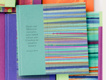 Format 17 x 17 und 1,5cm dick mit 144 Seiten. Das Papier ist naturweiß mit Büttenstruktur und der Buchblock fadengeheftet. Eingebunden in Gewebe (Buchbinderleinen) bedruckt, überzogen mit farbenfrohem handgemachtem Papier und Farbschnitt.