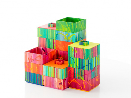 2,5mm Buchbinderpappe überzogen mit selbst gefertigten Buntpapieren und einfarbigen Papier. Sowohl alle Schachteln als auch der Deckel haben einen inne liegenden Fuß, der passgenau Halt gibt, wenn die Schachteln gestapelt sind. Dieser Fuß verleiht zudem eine Standfläche, die einen farblichen Abschluss bildet und Leichtigkeit vermittelt.