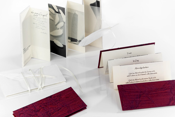 Diese kleinen Faltbücher mit festen Deckeln entstehen immer in Zusammenarbeit mit anderen Künstlern aus artverwandten Bereichen (Fotografie, Malerei, Grafik, Lyrik) Das erste dieser beliebten Reihe war das Engelleporello als Katalog der Ausstellung “Engel in Stein und Papier” bei stein-gestalten in Kirchheim-Ötlingen.